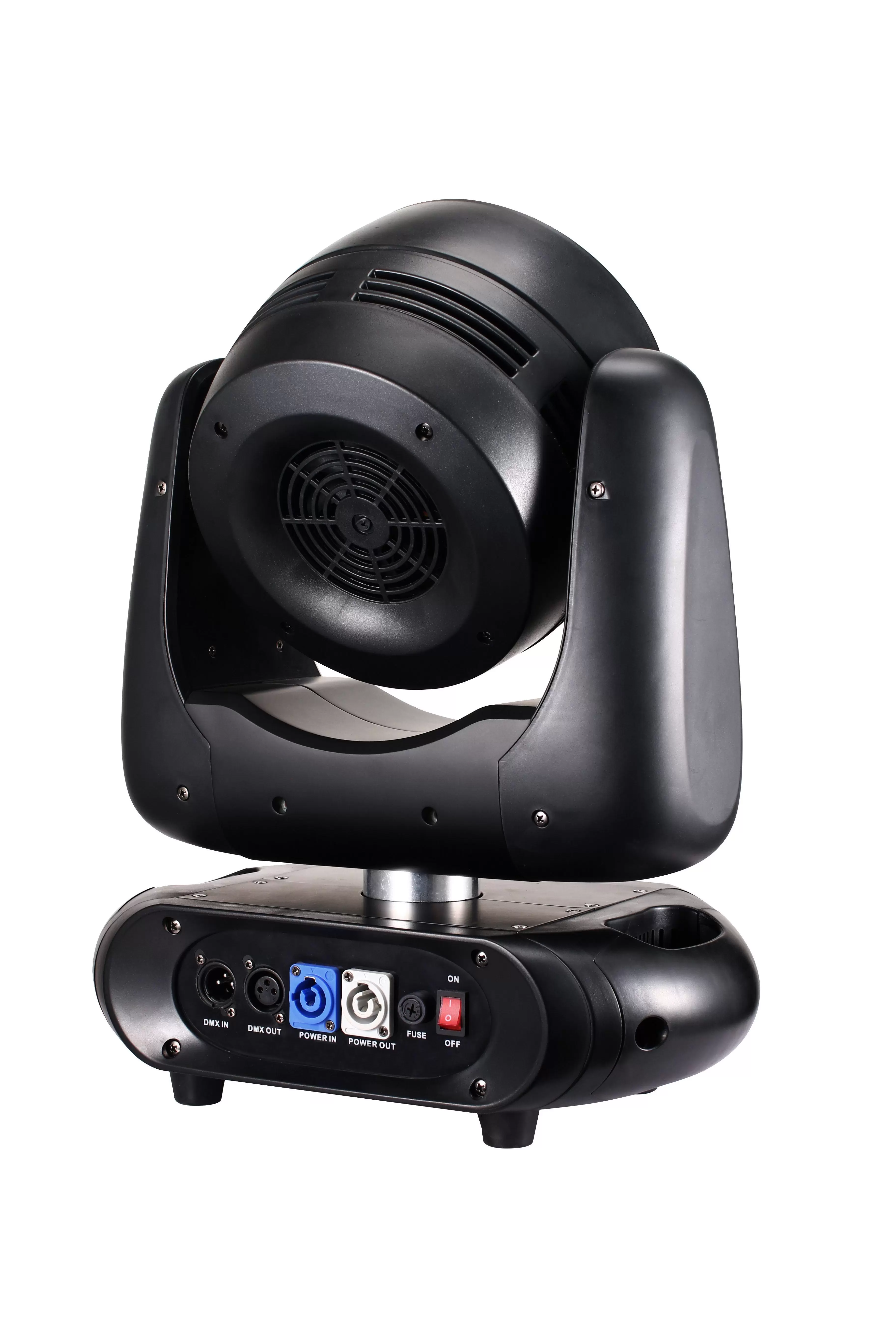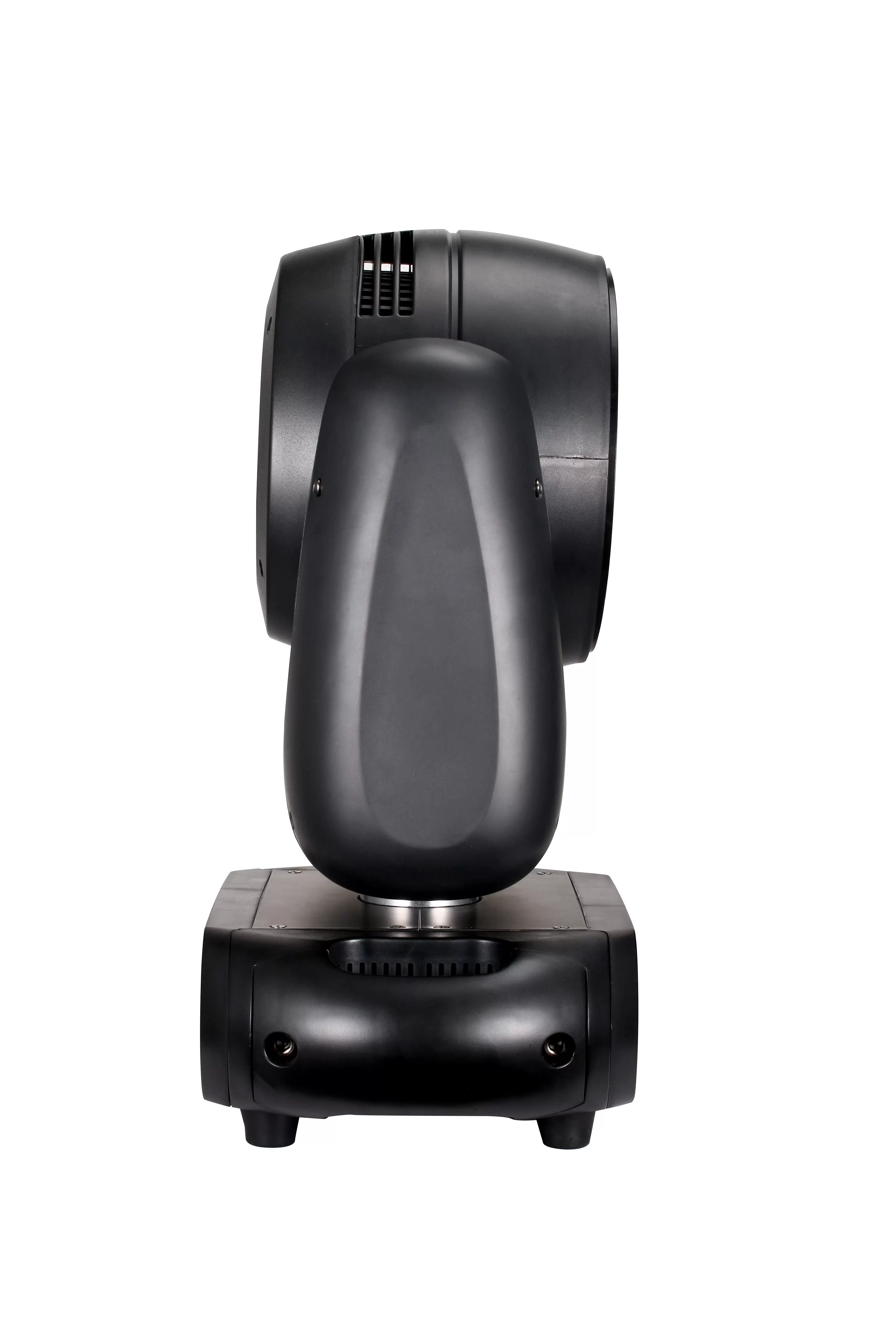 RGBW (red, green, blue, white) linear color mixing, 16.7 million colors (0 – 100% saturation adjustable), built-in macro function. Front mirror disc with reversible stepless rotation, seamless splicing mirror disc, aspherical lens structure, single lamp bead point control. Light strip effects: stroboscopic, running light effects, with built-in programs. Screen automatic rotation function. 4 – 45 DMX linear focusing, with automatic focusing function. Control modes: DMX512 control / manual / automatic. Built-in CTO DMX linear dimming. Protection class: IP20.